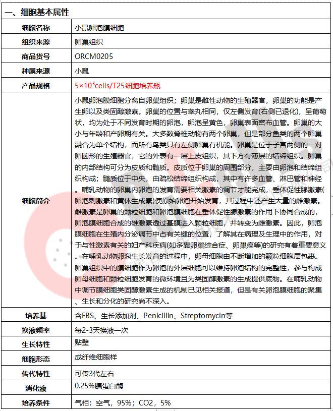 方法简介:澳睿赛实验室分离的小鼠卵泡膜细胞采用先机械分离后胶原酶消化结合Percoll密度梯度离 心法、并通过专用培养基培养筛选制备而来,细胞总量约为5×10⁵cells/瓶。