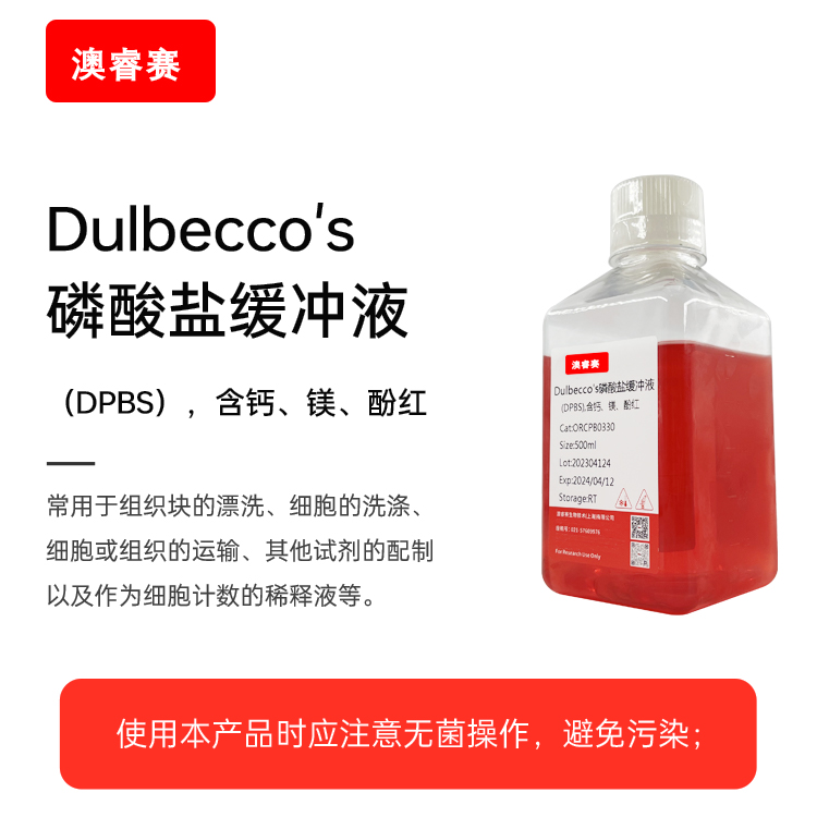 DPBS全称Dulbecco's Phosphate-Buffered Saline,中文名称杜氏磷酸缓冲盐溶液,是生物化学研究中常用的平衡盐溶液之一,主要成分包括NaCl、KCl、KH2PO4、Na2HPO4等。根据是否含有钙镁离子将DPBS分为两种,与常规PBS不同的是DPBS磷酸盐的含量稍低。DPBS主要用于胚胎学方面的研究,多用于胚胎的漂洗液,冻存液和培养液。此外,还可以在DPBS中加入葡萄糖、丙酮酸钠等,以更利于培养物的生长。