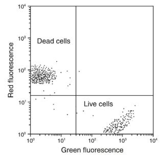 可以根据不同荧光强度来计算样品中活细胞和死细胞相对数量(以百分比表示),或者活细胞/死细胞的绝对数量。