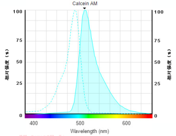 与其它同类试剂(如BCECF-AM和Carboxy-fluorescein diacetatc)相比,Calcein-AM是最适合作为荧光探针去染活细胞的,因为它的细胞毒性很低,而且不会抑制任何的细胞功能,如增殖和淋巴球的趋化性。Calcein的激发和发射波长分别为490 nm和515 nm。Calcein-AM仅对活细胞染色。