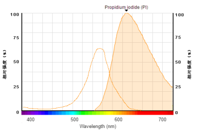 作为核染色染料的PI不能穿过质膜完整的活细胞的细胞膜,它可以穿过死细胞膜的受损膜的无序区域而到达细胞核,并嵌入细胞的DNA双螺旋从而在死细胞中产生红色荧光(激发:488,545nm,发射: 617 nm)。PI不会染色质膜完整的活细胞,仅对死细胞染色。