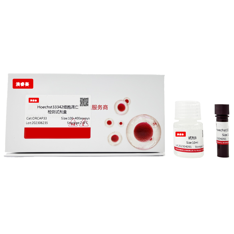 Hoechst33342染色试剂盒可用于细胞凋亡检测,也可用于普通的细胞核染色以及某些特定情况下的双链DNA染色,染色后可用荧光显微镜检测或流式细胞仪检测。Hoechst33342是一种可以穿透细胞膜的蓝色荧光染料,对细胞的毒性较低。Hoechst 33342能少许进入正常细胞膜,使其染上低蓝色,而凋亡细胞的膜通透性增强,因此进入凋亡细胞中的Hoechst 33342比正常细胞的多,荧光强度要比正常细胞中要高,此外,凋亡细胞的染色体DNA 的结构发生了改变从而使该染料能更有效地与 DNA 结合,并且凋亡细胞膜上的p-糖蛋白泵功能受到损伤不能有效地将Hoechst 33342排出到细胞外使之在细胞内积累增加等都使凋亡细胞的蓝色荧光增强。Hoechst 33342的最大激发波长为 346nm,最大发射波长为460nm;Hoechst 33342和双链DNA结合后,最大激发波长为350nm,最大发射波长为461nm