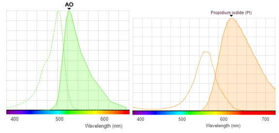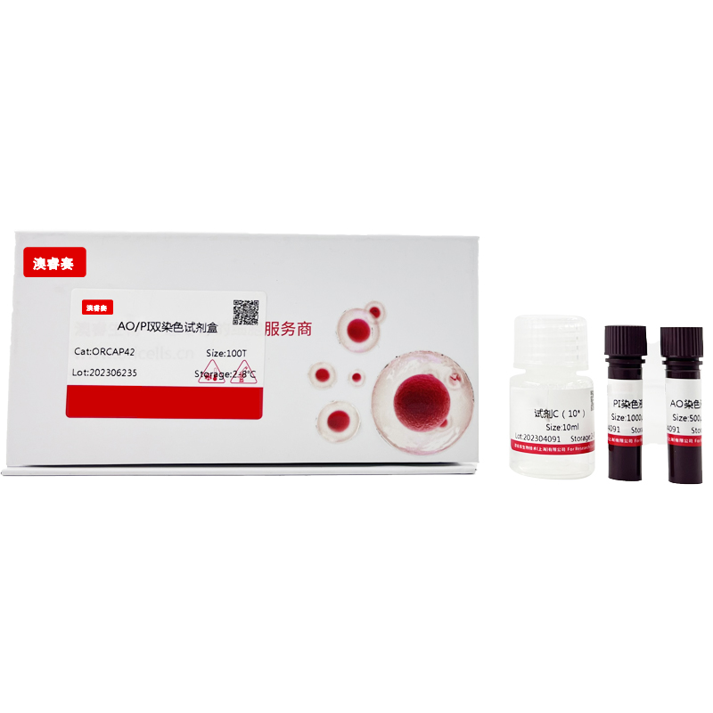 AO/PI双染细胞凋亡检测试剂盒是采用DNA探针双染细胞核的方法检测细胞的状态。叶啶橙(Acridine Orangc,AO)为一种荧光染料,该染料具有膜通透性,能透过细胞膜,使核DNA和RNA染色。其激发波长为488nm,吸收波长为515nm。它与细胞中 DNA和RNA结合量存在差别,复合物可发出不同颜色的荧光,红色荧光为AO-DNA(F>600nm),绿色荧光为AO-RNA或单链 DNA(F>530nm)。