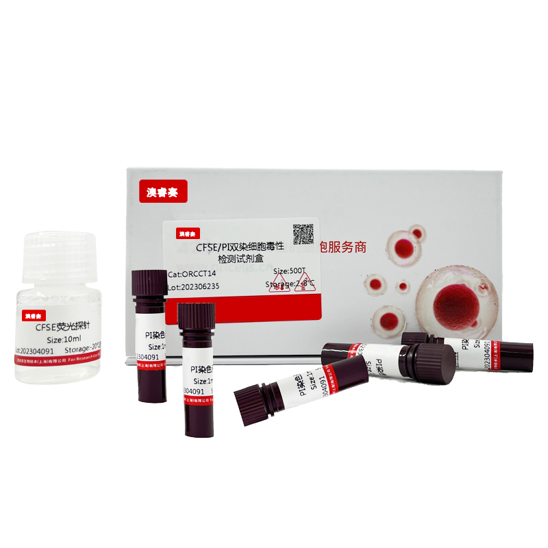 CFSE/PI双染细胞毒性检测试剂盒是利用细胞荧光染料CFSE(CFDA-SE)和PI对细胞进行染色,利用CFSE标记靶细胞,PI标记死的靶细胞来区分不同的细胞,活的靶细胞成绿色,死的靶细胞成红色和绿色,从而检测细胞毒性作用。